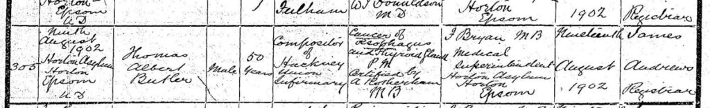 His death certificate shows that he was aged 50 when died on 9th August 1902 from cancer of the oesophagus and thyroid gland*. It also stated that he was a ‘Compositor of Hackney Union Infirmary’.