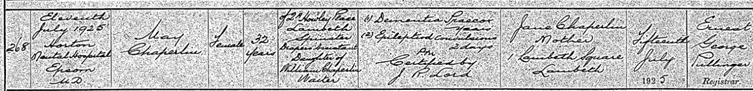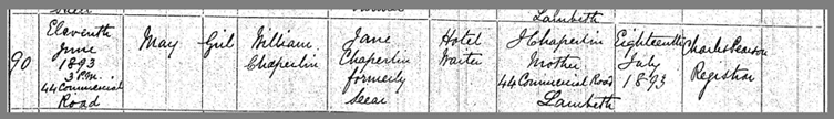 May Chaperlin was born at 3pm on 11th June 1893 at 44 Commercial Road, Lambeth, to William & Jane Chaperlin (née Seear). The time-stamp on the birth certificate indicates that May was a twin; her twin brother was named Ernest Randolph. On her birth certificate May’s father is recorded as a ‘hotel waiter’. Her father was born in London (probably Westminster) and her mother in Watford, Hertfordshire. Despite her parents claim on the 1911 Census to have been married c1883, I have not been able to locate a marriage entry.