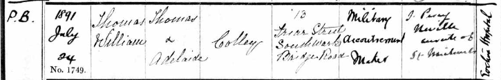 Later that same year we have young Thomas’s baptism which took place privately in the Evalina Hospital, Lambeth on 24 July 1891. The address given here is 13 Frear St, Southwark Bridge Rd, Lambeth.  Presumably Thomas was seriously unwell and an emergency baptism was called for.