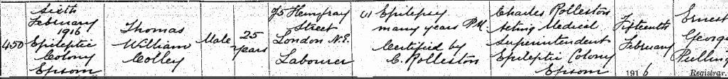 Returning to our subject, Thomas William Colley was admitted to the Epileptic Colony, Epsom on 16th Feb 1906, just two months before his 16th birthday. He was said to be “violent at times and tired of life”. His occupation was given as ‘factory hand’ His care was chargeable to Hackney.