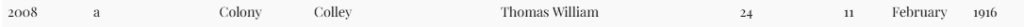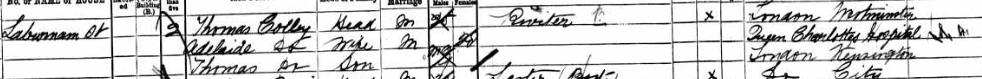 Adelaide states on Thomas’s admission note that he is the third child in a family of four. I have found the first, Alfred born 1881, died 1886 but apart from Thomas Colley I cannot account for the other two children who, she says, are all dead.  It was a long and difficult search as I cannot be sure which name she was using at the time.