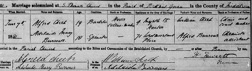 On 7th June 1881 Adelaide married Alfred Cheek at St Thomas’s Church, Bethnal Green. Alfred was 19 years and Adelaide just 18years.
