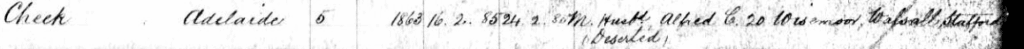 It would appear that Adelaide was already pregnant as a son was born in the Sept Q of that year, Alfred William Cheek. Sadly young Alfred died in 1886 and our subject, Thomas Colley, says in his notes that he thinks he had a brother who died of convulsions before he was born.