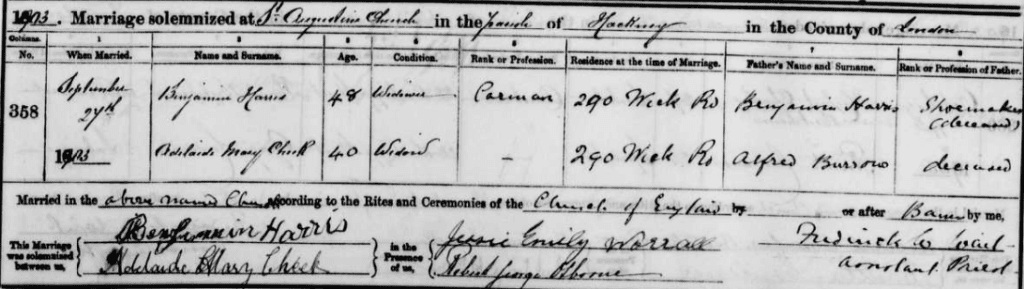 Three years later, on Sept 27th 1903, Adelaide marries Benjamin Harris (1855 – ?) at St Augustine’s Church, Hackney, claiming that she is a widow. Young Thomas would have been about 12yrs at this point.