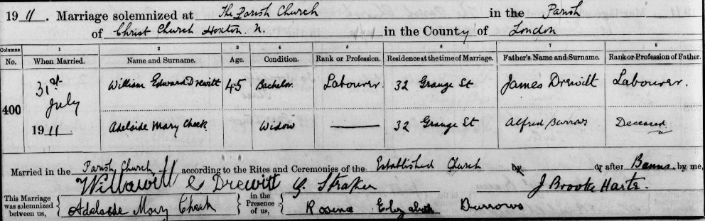 However we do know that on 31st July 1911 at Christchurch, Hoxton, Adelaide Cheek marries William Edward Drewitt.