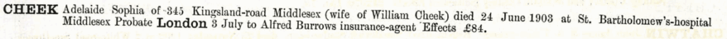 Happily for Adelaide Sophia she later, in 1889, married a man called William Cheek (1837 – 1906) himself twice widowed, and it was William’s son Alfred Cheek, bn 1862 to his first wife, who later married Adelaide Sophia’s daughter, Adelaide Mary Burrows (our Thomas’s mother) in 1881.