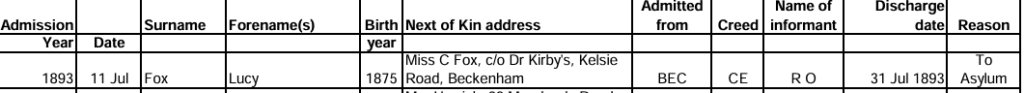 Her next of kin is Miss C Fox (we presume her sister) of c/o Dr Kirby’s Kelsie Road, Beckenham