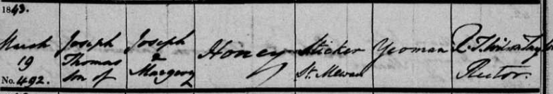 All were baptised in St Mewan’s Church including Joseph Thomas on 19th March 1843 when the family address is “Sticker”, St.Mewan and his father is a “Yeoman”.