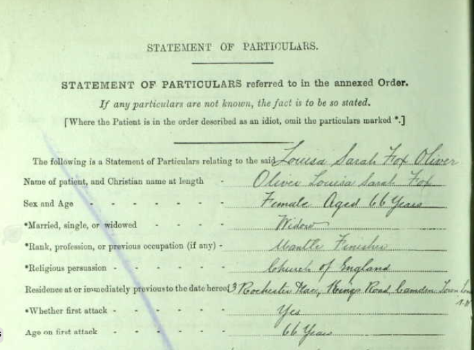 Louisa Sarah Fox Oliver was admitted from Fisherton to Horton Asylum on 8 September 1899. At the time of her admission, she was 66 years old and is listed as a widow. Her occupation was a mantle finisher.