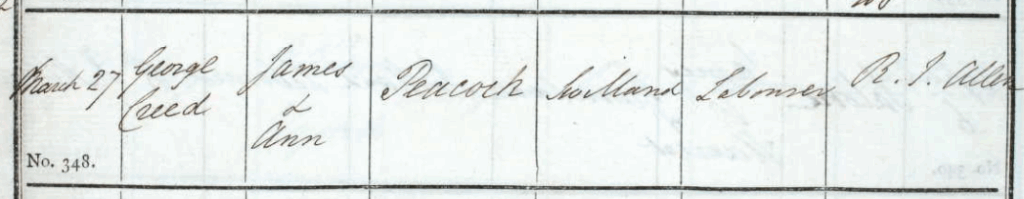 George Creed Peacock was born in Swilland, Suffolk to Ann (née Creed) and James Peacock, a farm labourer, on the 16th May 1860. He was the sixth of ten children. His birth was registered as plain George but at his baptism at St Mary, Swilland on 27th March 1862 he was given the second forename of Creed.