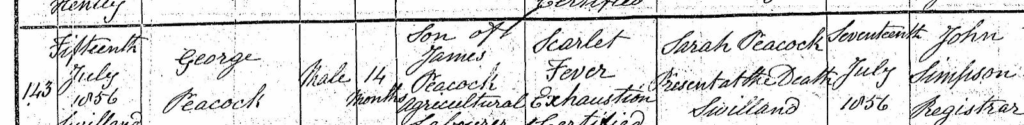 Ann Matilda was born in 1852 followed by the first George in Q1 1855. Sadly, George died on 15th July 1856 aged 14 months. The cause of death was Scarlet Fever, Exhaustion.