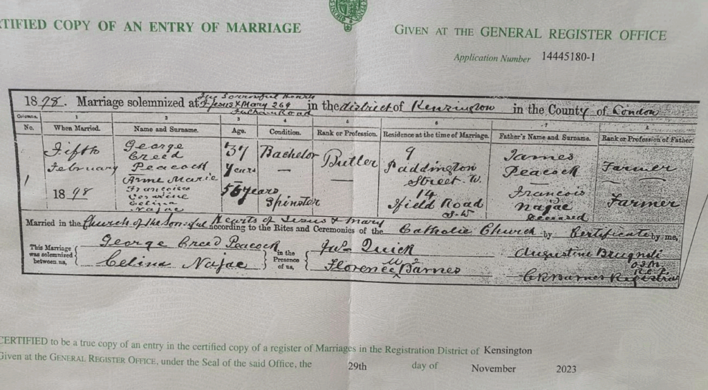 Their marriage certificate records that George is a 37-year-old bachelor, working as a butler and residing at 9 Paddington Street, W. This appears to be an accommodation address. The bride, who signs as Celina Najac, is 56, a spinster, and residing at 14 Ifield Road, SW. This is also apparently an accommodation address. Her father is Francois Najac, a deceased farmer.