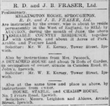 The next mention we find of Celina is a series of newspaper advertisements in May 1899 placed by the Ipswich Estate Agents R. D. and J. B Fraser saying that they had been instructed by Mrs Peacock to sell her detached house and its surrounding garden of 76 rods (about half an acre) in Camden Road, Ipswich. This was followed by another series of advertisements from June 1899 by the same agents that do not name Mrs Peacock but announce the sale by auction of a property in Camden Road with a similar description.