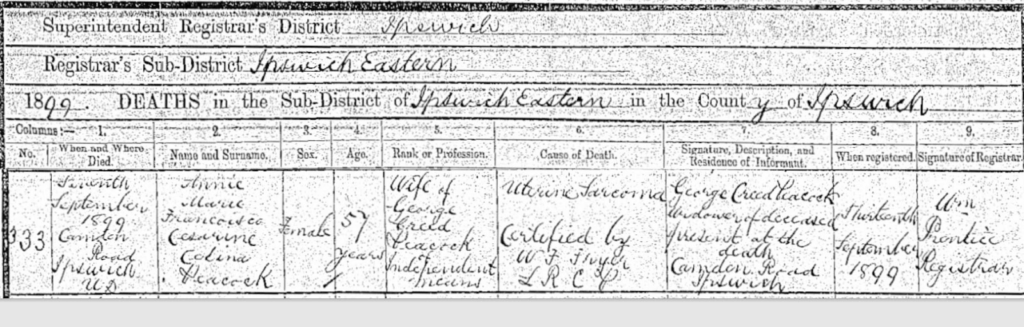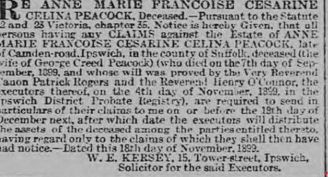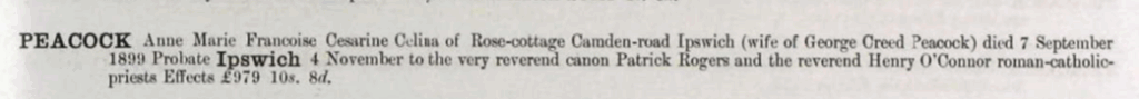 Not long after Celina’s death newspaper advertisements were placed by the Ipswich solicitor W. E. Kersey asking for any persons having claims against her estate to contact him. The advertisements name George Creed Peacock as Celina’s husband but also say that Celina’s will has been proved by The Very Reverend Canon Patrick Rogers and the Reverend Henry O’Connor who were her executors. Rogers and O’Connor were priests at St Pancras Catholic Church which we can assume was the church Celina attended in Ipswich.