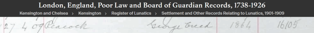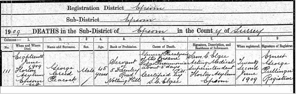 The recorded cause of death was General Paralysis of the Insane (the final stage of syphylis infection), Lobar Pneumonia 5 days. George’s occupation was given as Servant and his previous address as 5 Darnley Road, Notting Hill. His age was given as 45 which was based on the wrong year of birth in the Poor Law record.