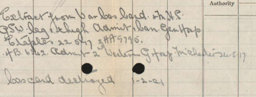 He was injured during the war and had received a gunshot wound to his leg and thigh. We find this event in the records, taking place in Etaples, France on 22nd May 1917.