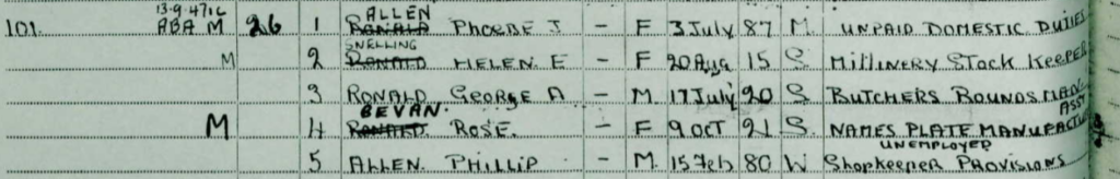 The above change of name indicated for Phoebe, from Ronald to Allen tells us that she remarried at a later date. In fact, she married Phillip Allen 13th September 1947 in Battersea. Family oral history believes that Philip did in fact want to marry Rose, who was very much younger than he was.